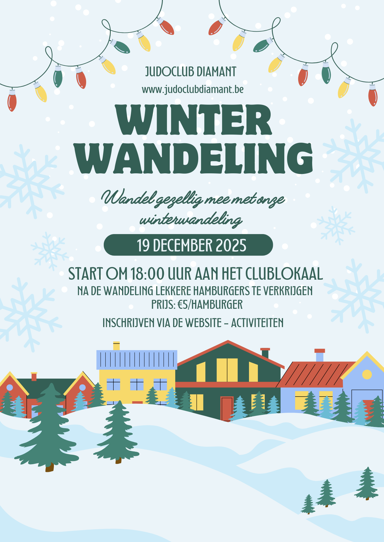 Op vrijdag 19 december 2025 zal er geen training doorgaan. In plaats daarvan nodigen we iedereen graag uit voor een gezellige winterwandeling met de hele judoclub!